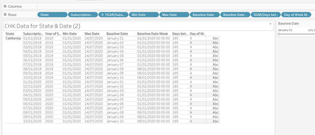Add Baseline Date to the Filter shelf, choose Range of Dates , and by default the dates 01 Jan 2020 to 14 Jul 2020 should be displayed