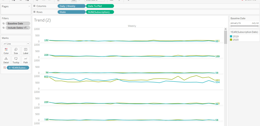 When added to the actual viz, this field is formatted to dd mmm ie 01 Jan, and then is plotted as a continuous, exact date (green pill) field on the Columns alongside the Daily | Weekly field, with State & Subscription on Rows. The YEAR(Subscription Date) provides the separation of the data into 2 lines.