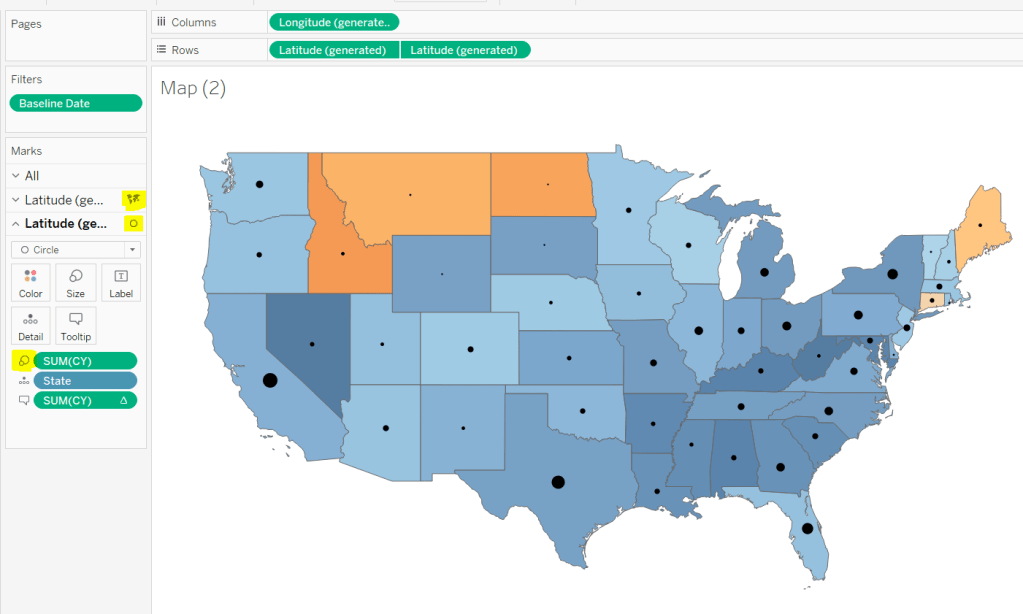 This is achieved using a dual axis map (via a second instance of the Latitude pill on Rows). One ‘axis’ is a map mark type coloured by the YoY% and the other is a circle mark type, sized by CY, explicitly coloured black.
