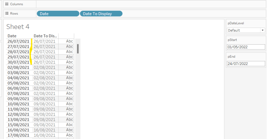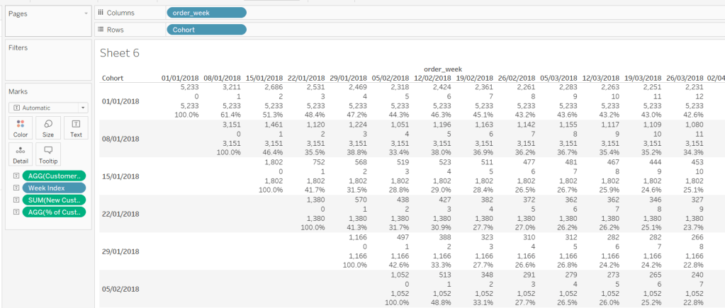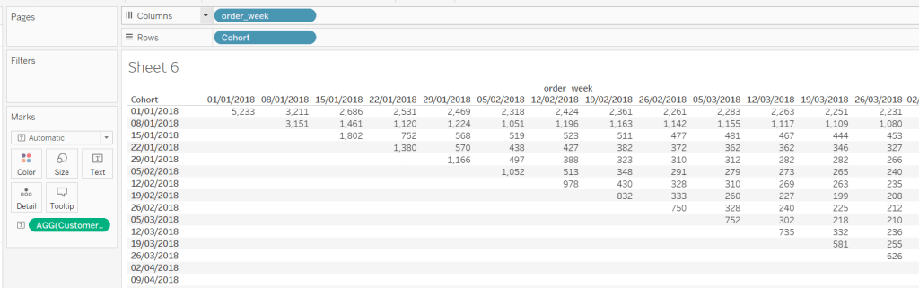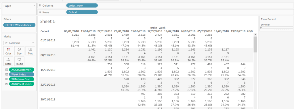 so, this time, we’re only returning data for the Orders1 table and nothing for the Orders table. But we’re also adjusting the value by 5. This is because by default, when using the square mark type which we’ll use for the heatmap, the centre of the square is positioned at the plot point. So if the square is plotted at 10, the vertical edges of the square will be above and below 10. However, we need the square to be centred between the bin range points, so we shift the plot point by half of the bin size (ie 5).