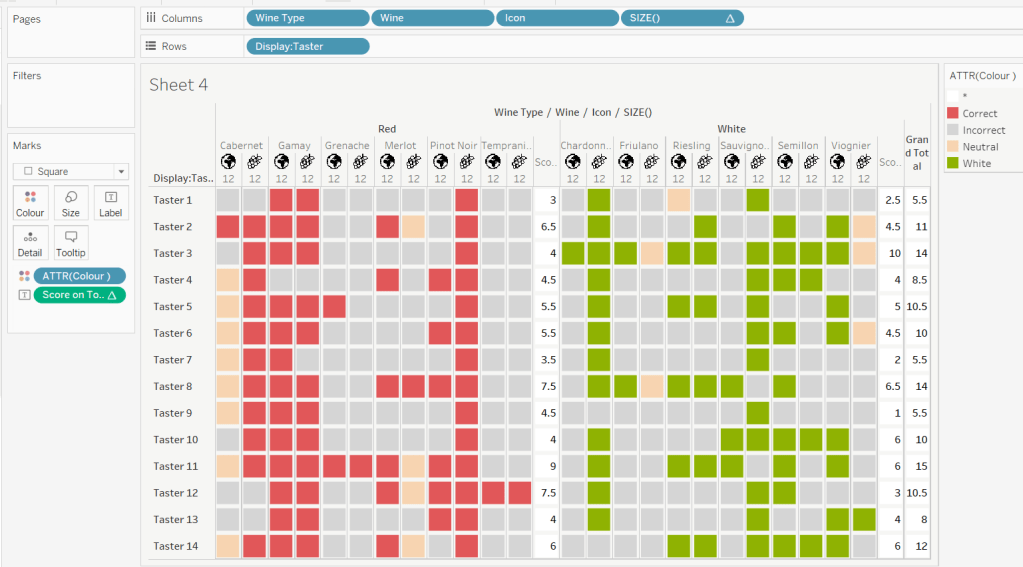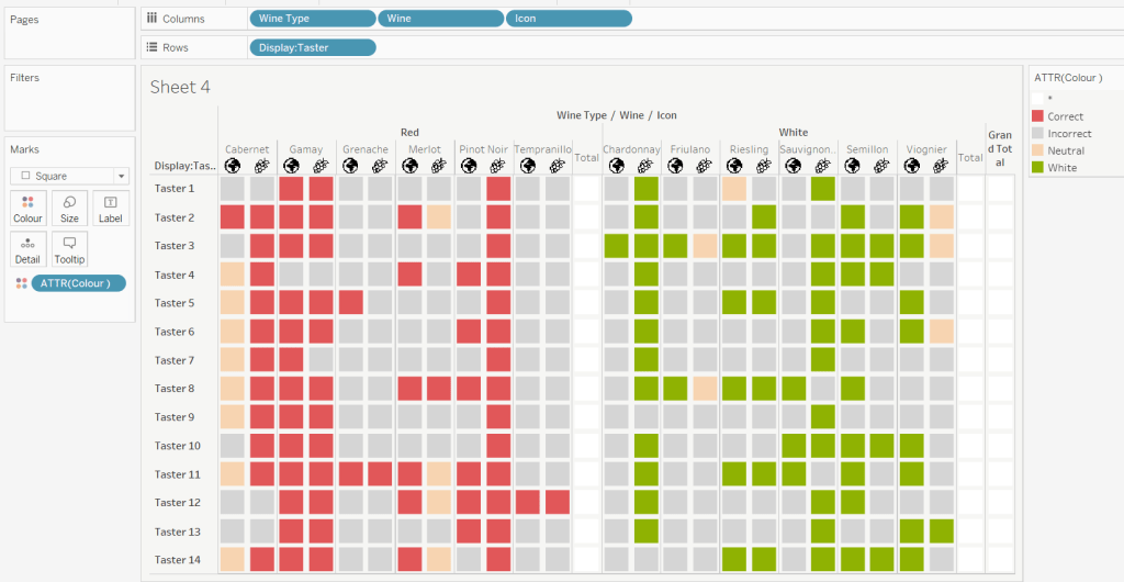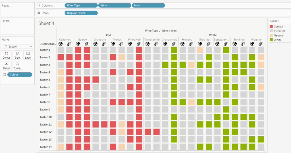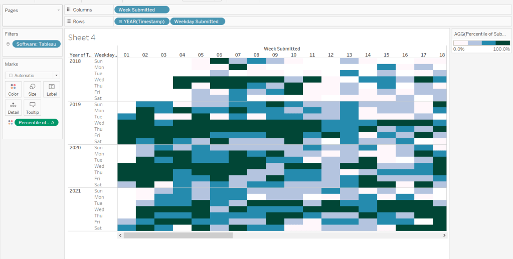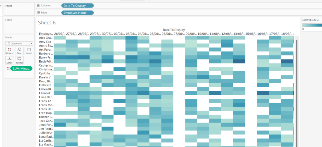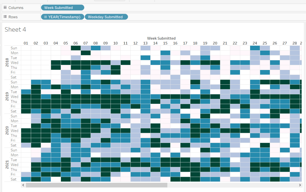 Then add the sheet to an 800 by 800 sized dashboard. You will need to make tweaks to the padding and potentially sizing of the heat map marks again to get the squares to position centrally with white surround. I added inner padding of 60px to the left & right of the chart on the dashboard, to help make the chart itself squarer.