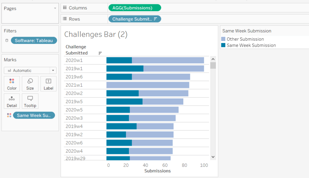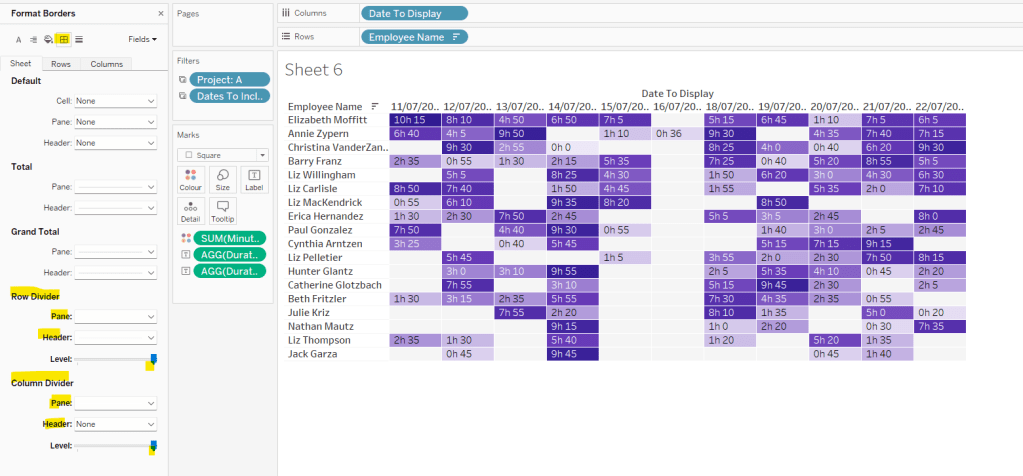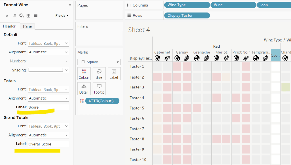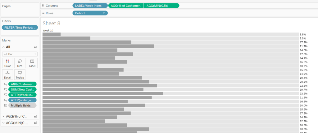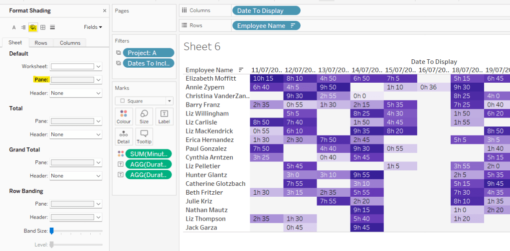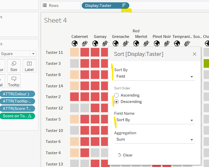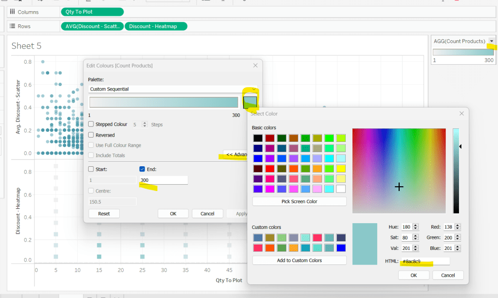 Then make the chart dual axis and synchronise axis. Increase the size of the square heat map marks (note don’t worry how these look at this point, the layout will adjust when added to the dashboard. Right click on the Discount – Heatmap axis on the right and move marks to back. Hide that axis too.