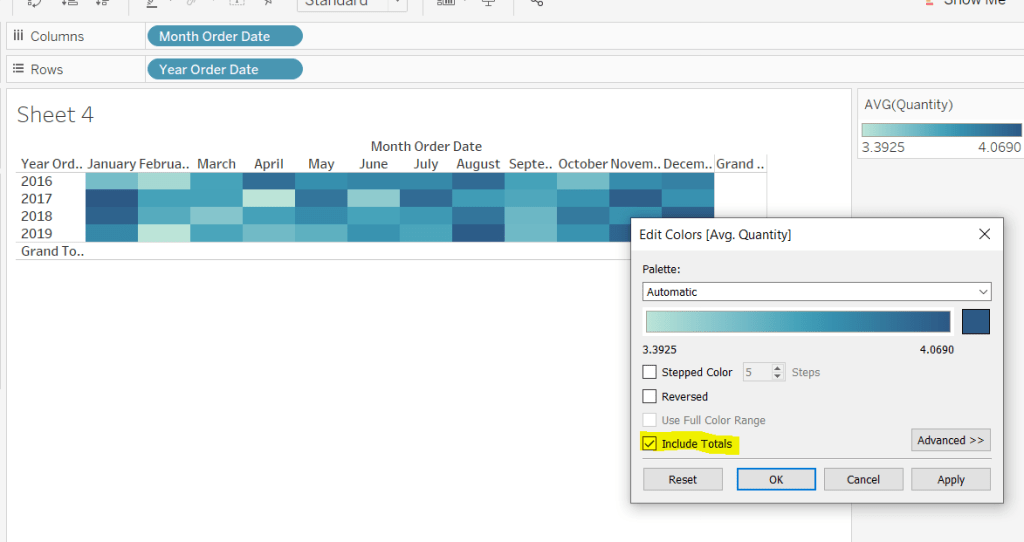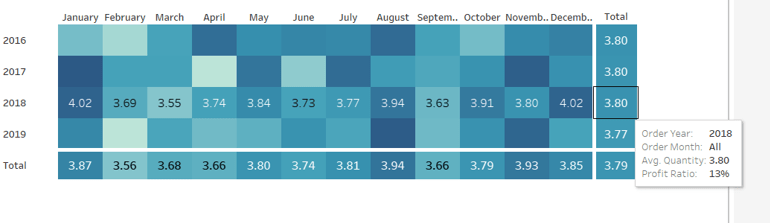 Add Qty Range Min, Qty Range Max, Discount Range Min, Discount Range Max to the Tooltip shelf of the heatmap marks card. Set all to aggregate to AVG and adjust tooltip to suit.