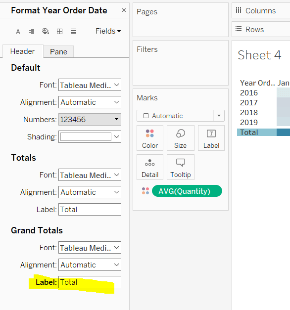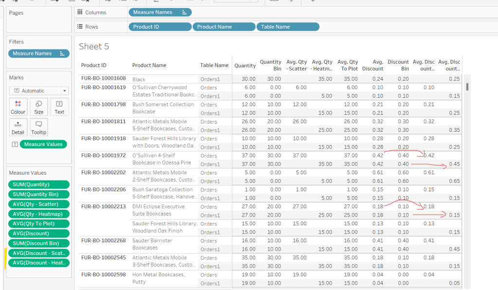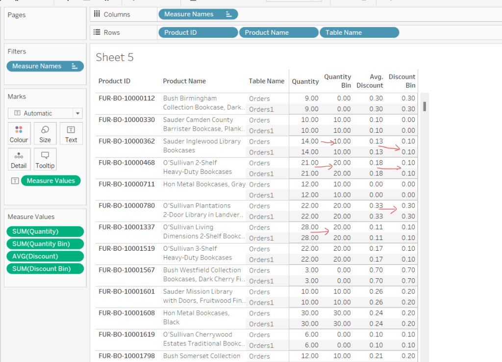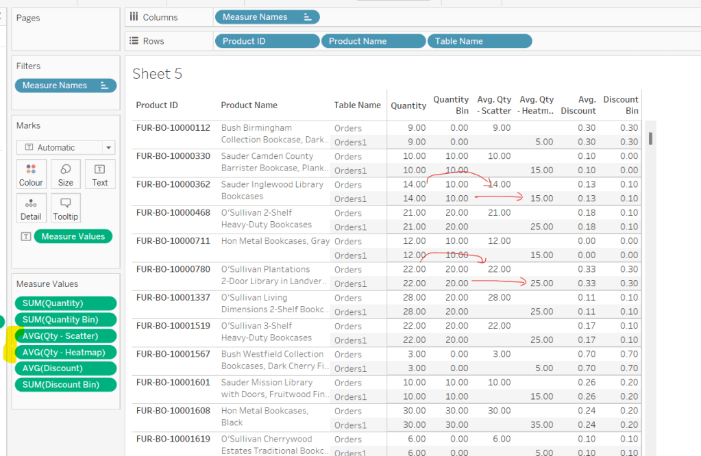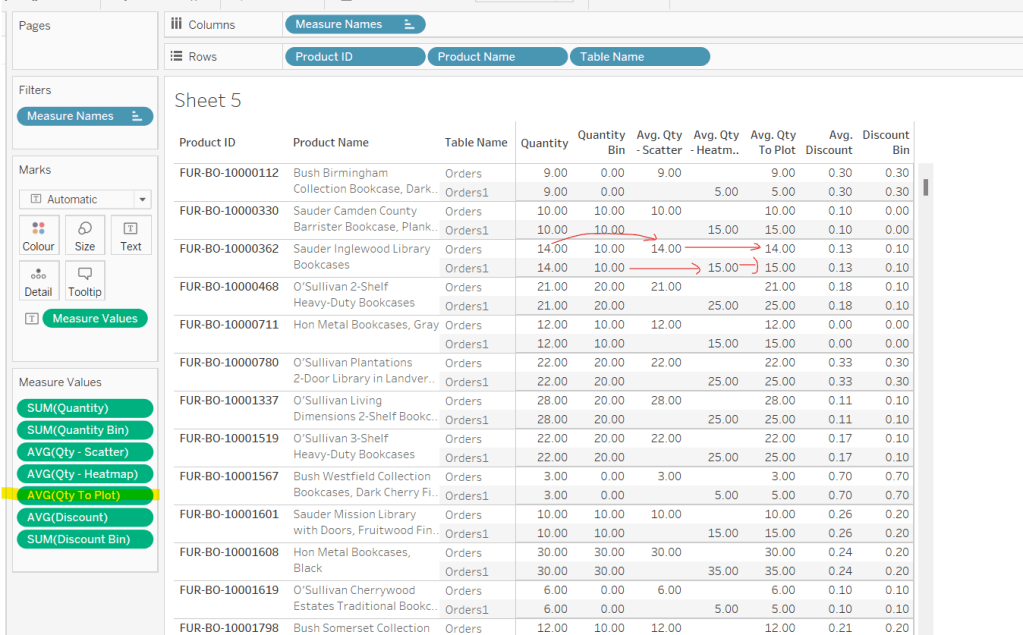 Onto a sheet add Product ID, Product Name and Table Name to Rows (Note – there are multiple Product Names with the same Product ID, so I’m treating the combination as a unique product). Then add Quantity to Text. The drag Discount and drop onto the table when it says ‘Show Me’, which should automatically add Measure Name/Measure Values into the view. Aggregate Discount to AVG. We can see that we’re getting the same values for each Table Name, which is expected.