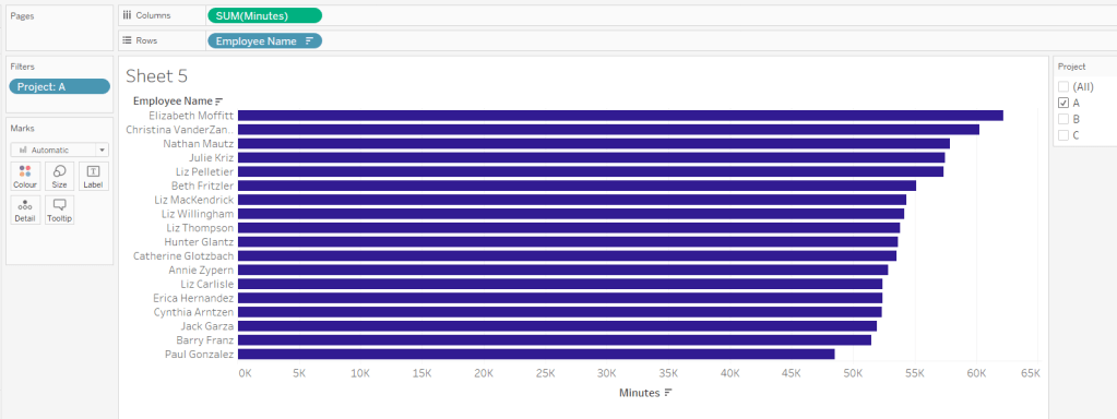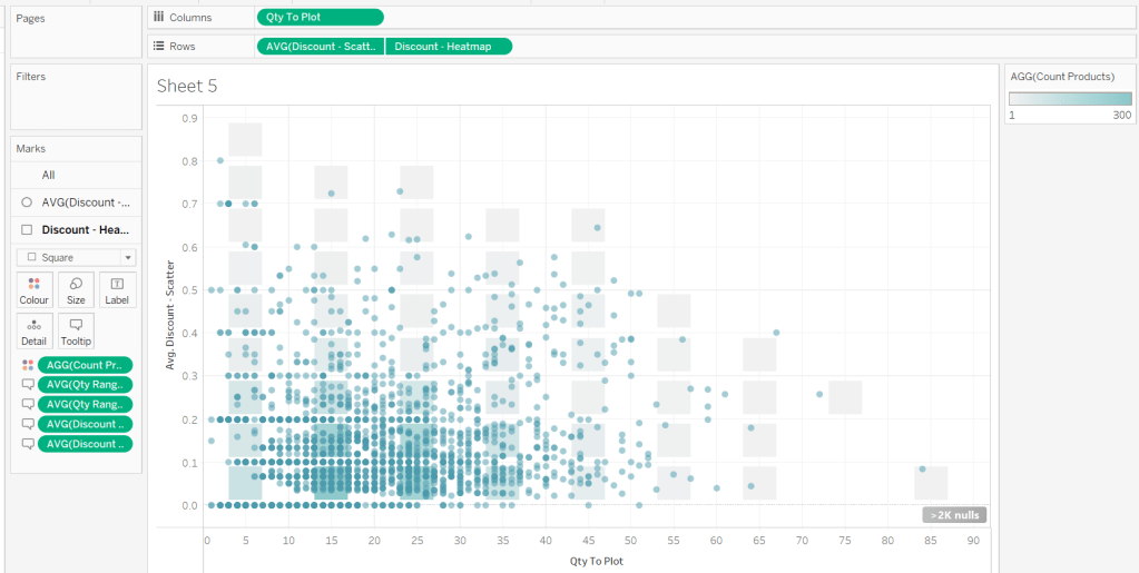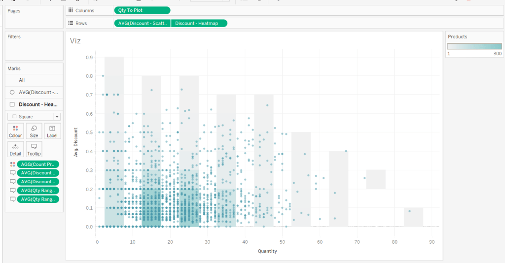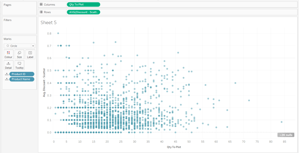 On a new sheet, add Qty to Plot to Columns and change to be a dimension (so not aggregated to SUM) and Discount – Scatter (set to AVG) to Rows. Add Product ID and Product Name to Detail. Change the mark type to Circle and adjust the size. Adjust the Colour and reduce the opacity (I used #4a9aab at 50%)