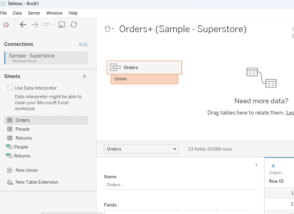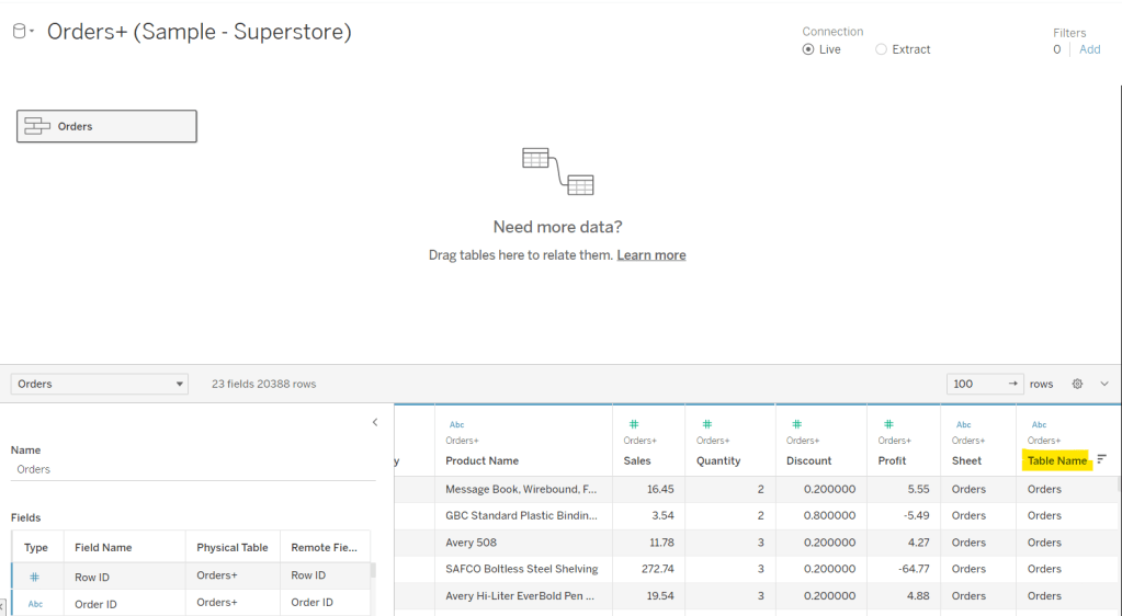 The union basically means the rows in the Orders data set are all duplicated, but an additional column called Table Name gets automatically added