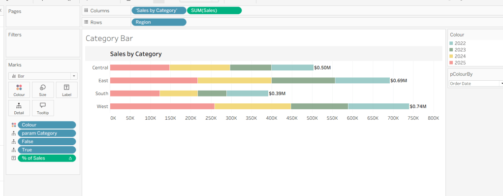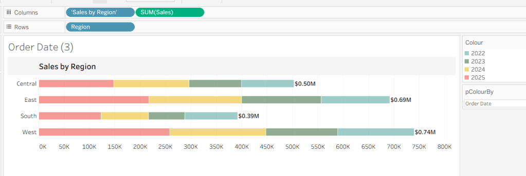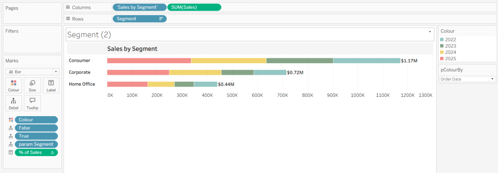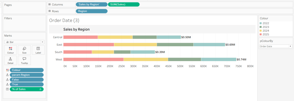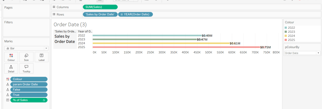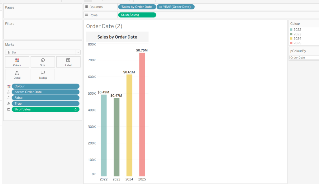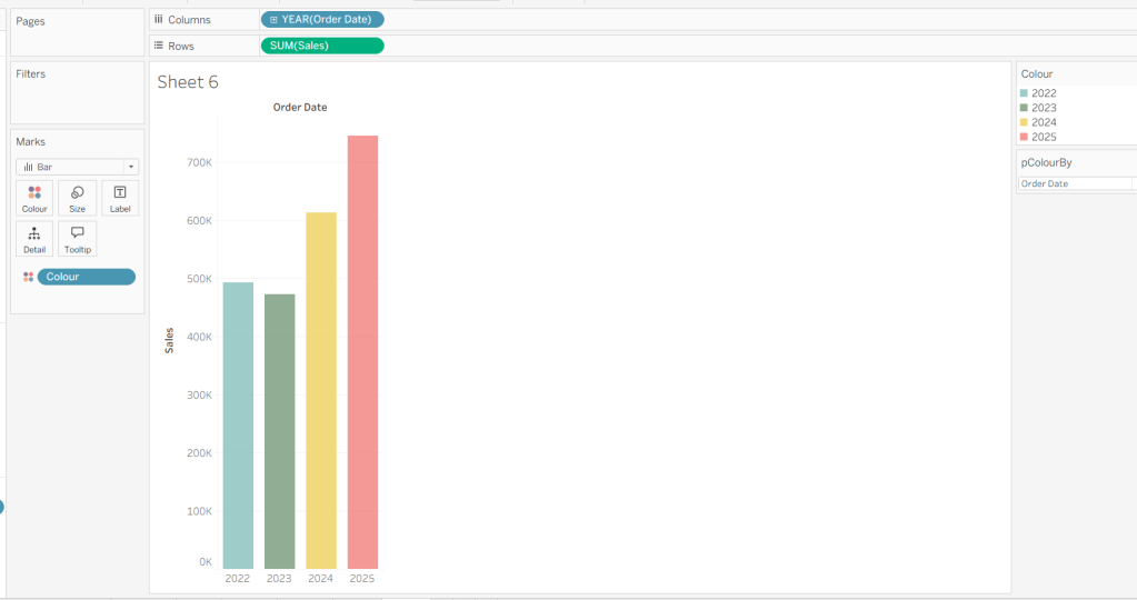 On a new sheet, add Order Date to Columns and Sales to Rows. Change the mark type to Bar and add Colour to the Colour shelf. Adjust the colours to suit, set the opacity to 70% and add a white border. Show the pColourBy parameter.