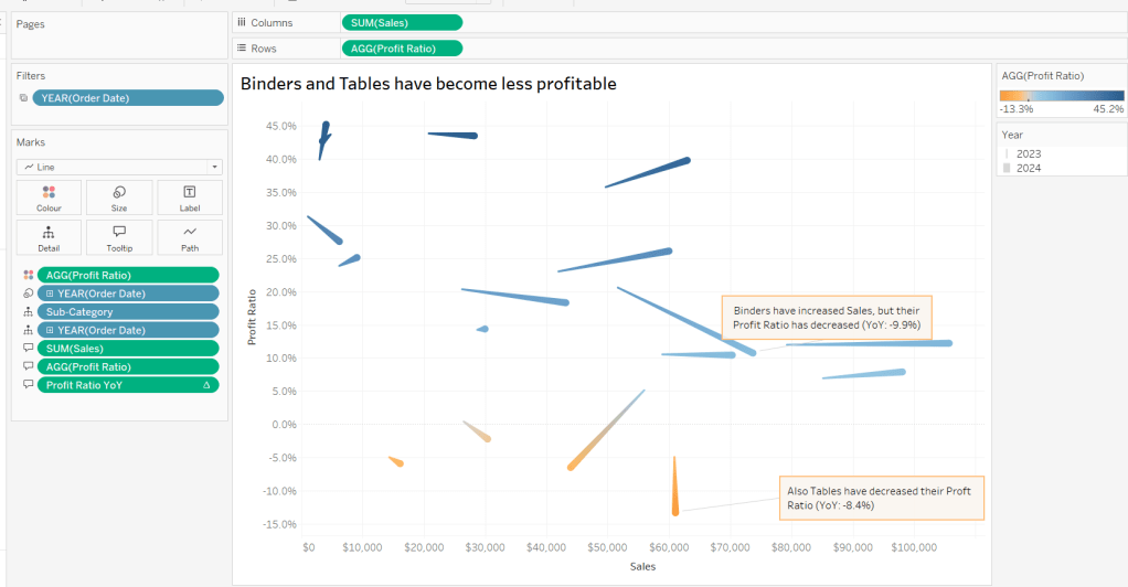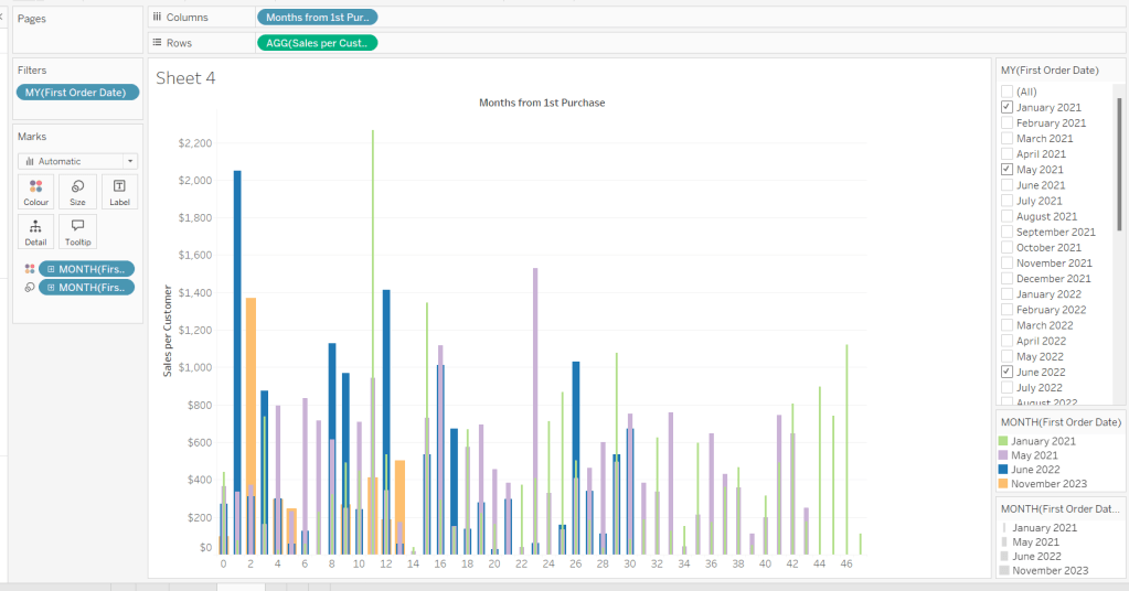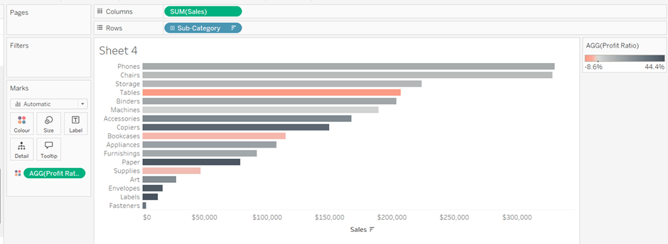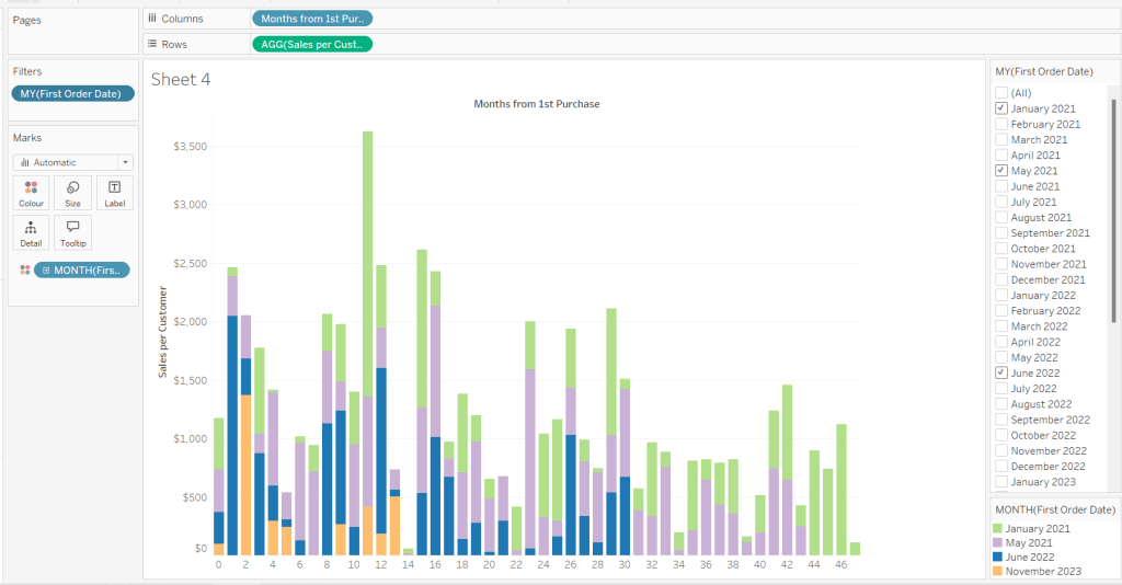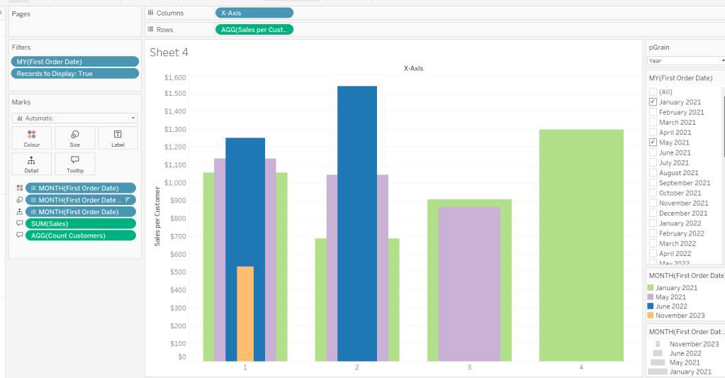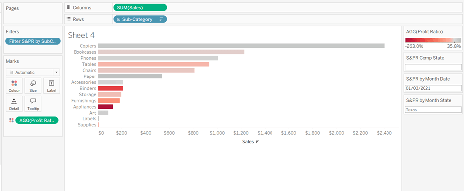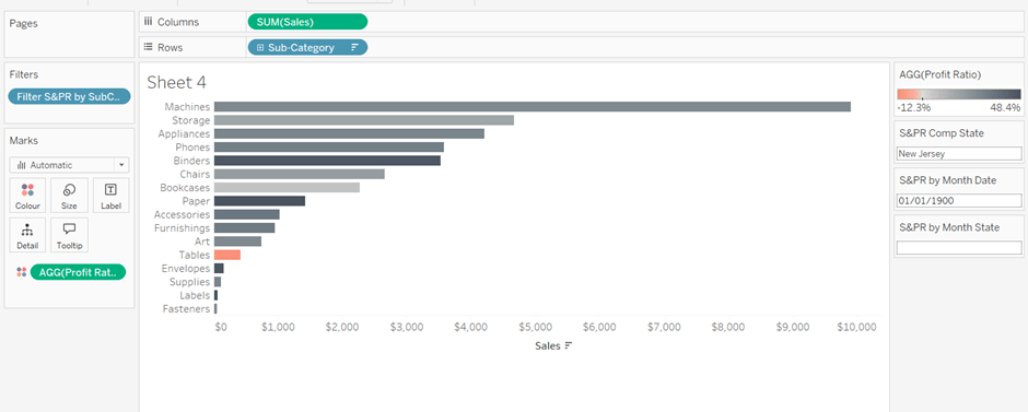 On a new sheet, add Order Date to Columns and Sales to Rows. Change the mark type to Bar and add Colour to the Colour shelf. Adjust the colours to suit, set the opacity to 70% and add a white border. Show the pColourBy parameter.