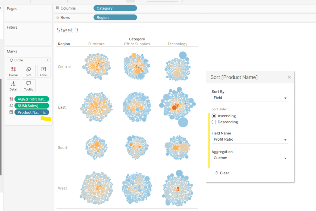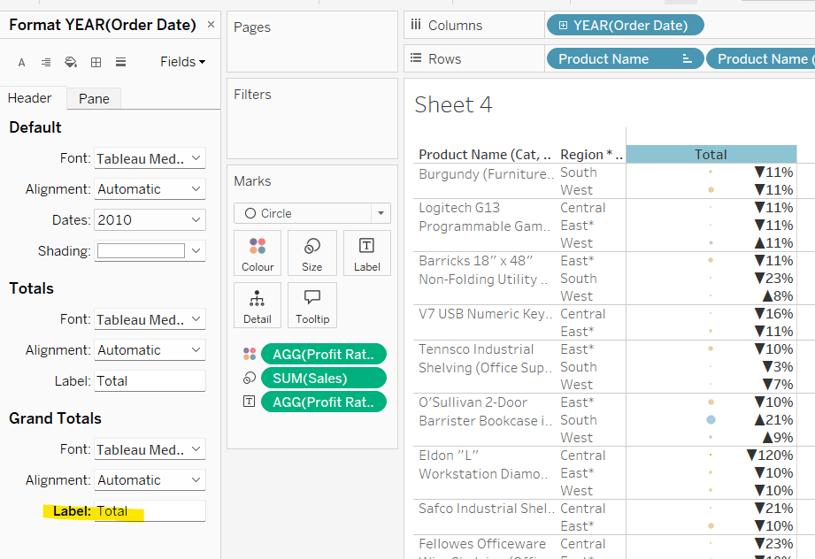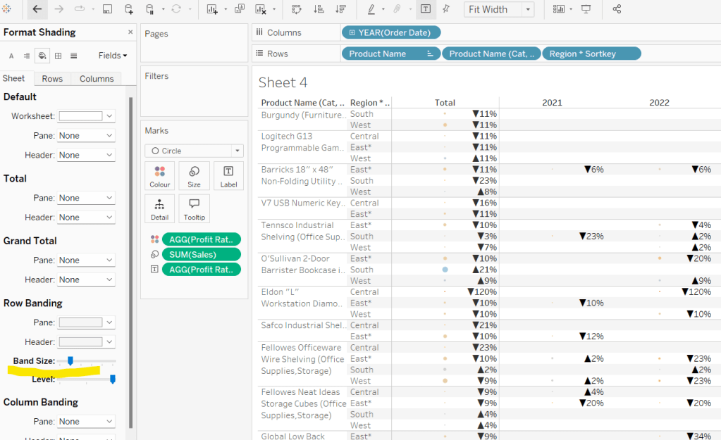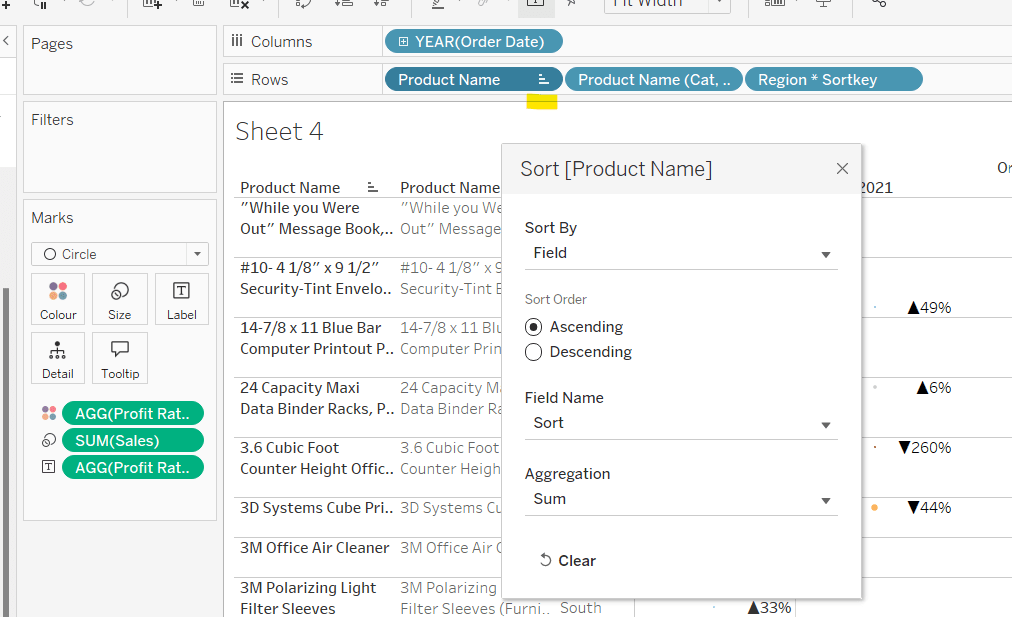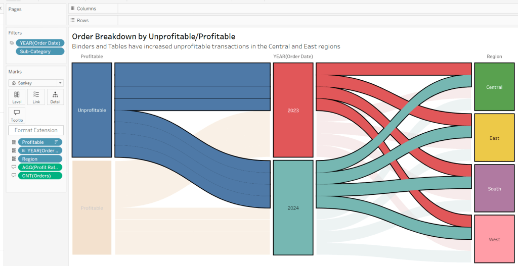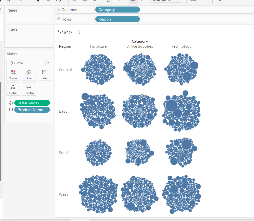 Move the ‘Sales by Order Date’ pill from Rows to Columns and update the text to become ‘Sales by Region’ instead. Drag the Region pill and drop it directly over the Order Date pill on the Rows so it replaces it and all references to the field are replaced too. Widen the rows.