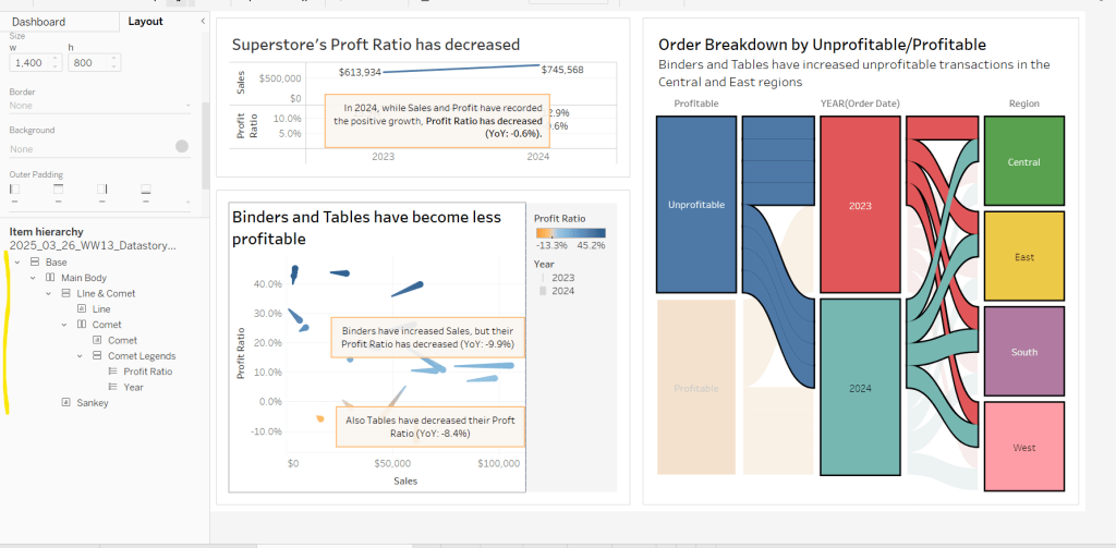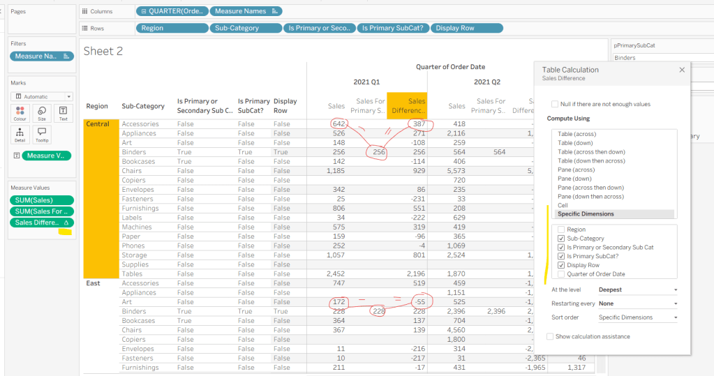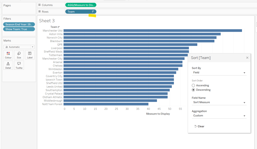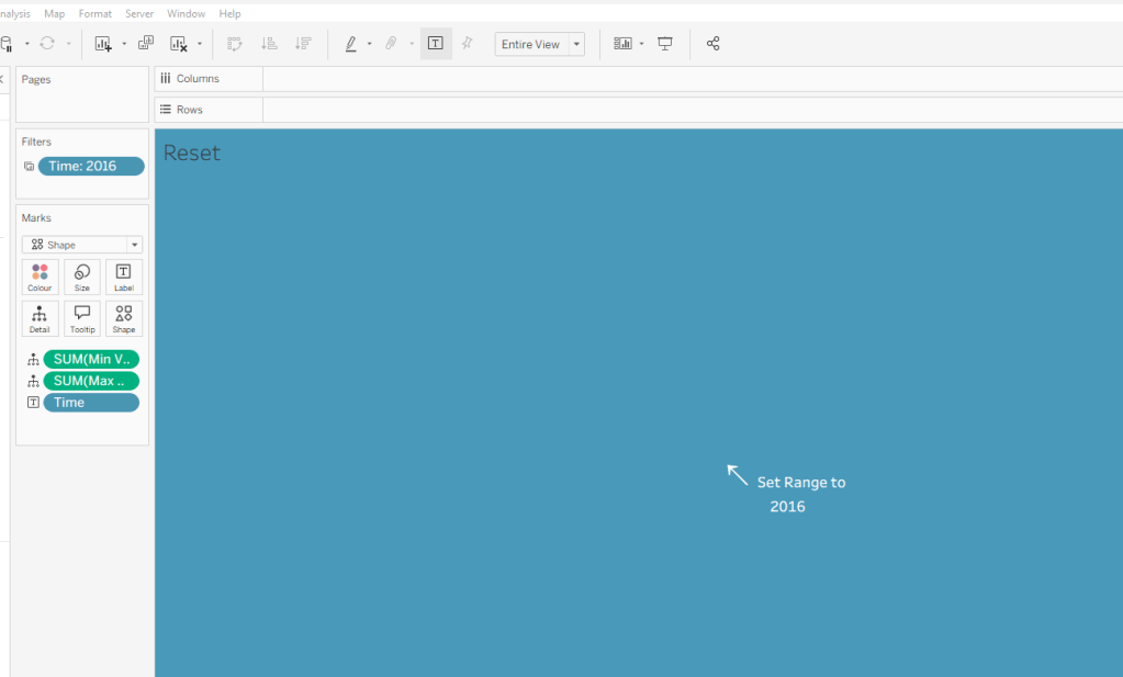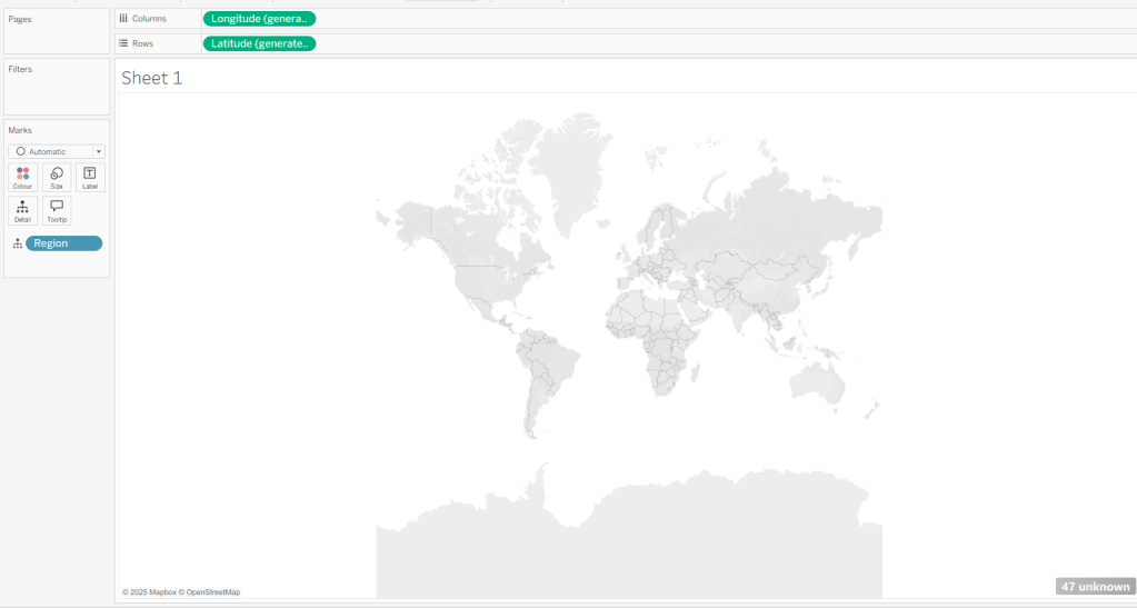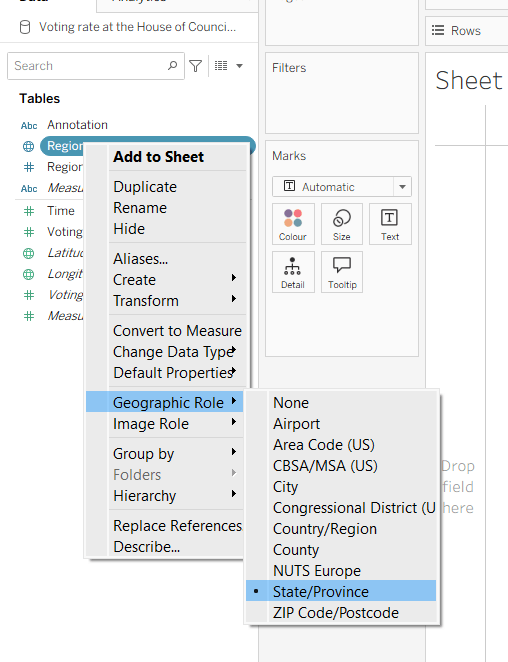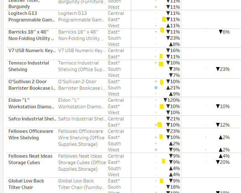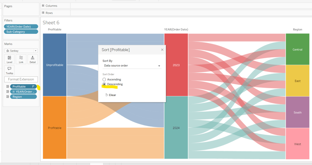 Move the ‘Sales by Order Date’ pill from Rows to Columns and update the text to become ‘Sales by Region’ instead. Drag the Region pill and drop it directly over the Order Date pill on the Rows so it replaces it and all references to the field are replaced too. Widen the rows.