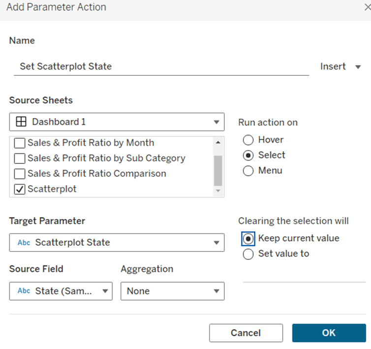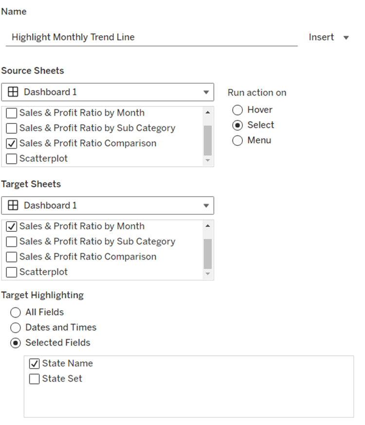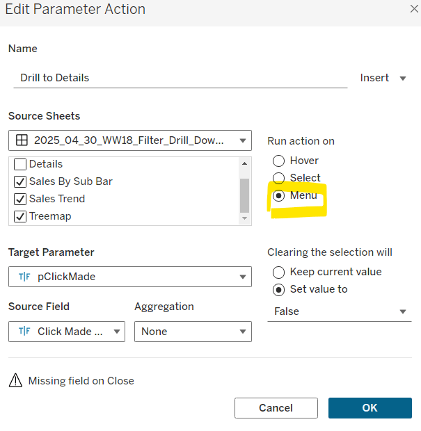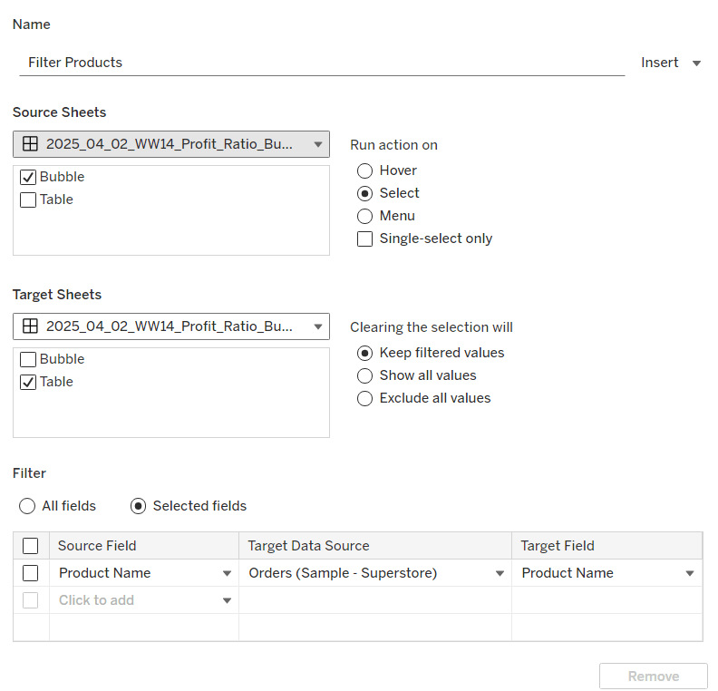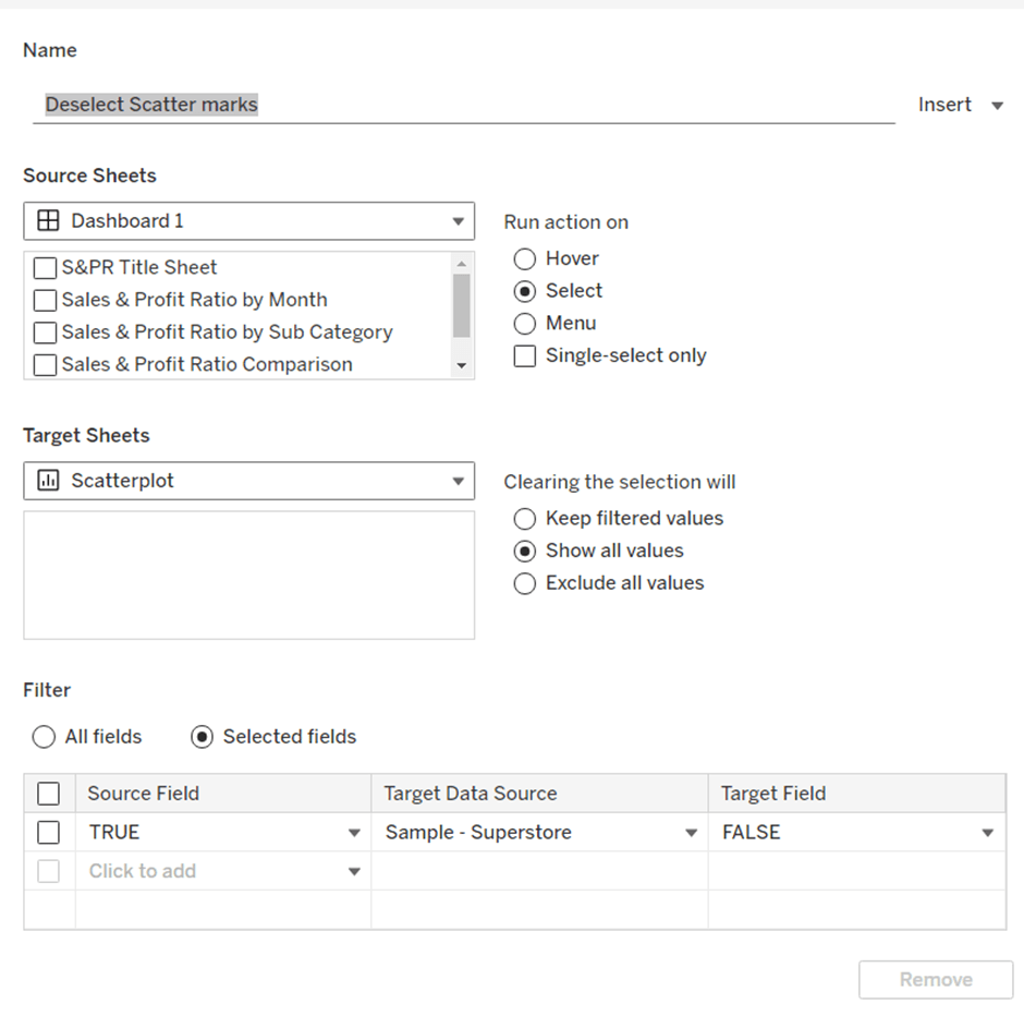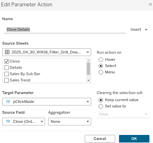 On select of the Order Date sheet on the dashboard, target the Order Date worksheet directly, passing the selected values of True = False. Show all values when selection is cleared.