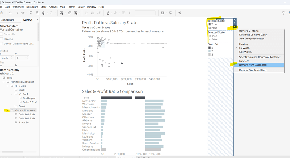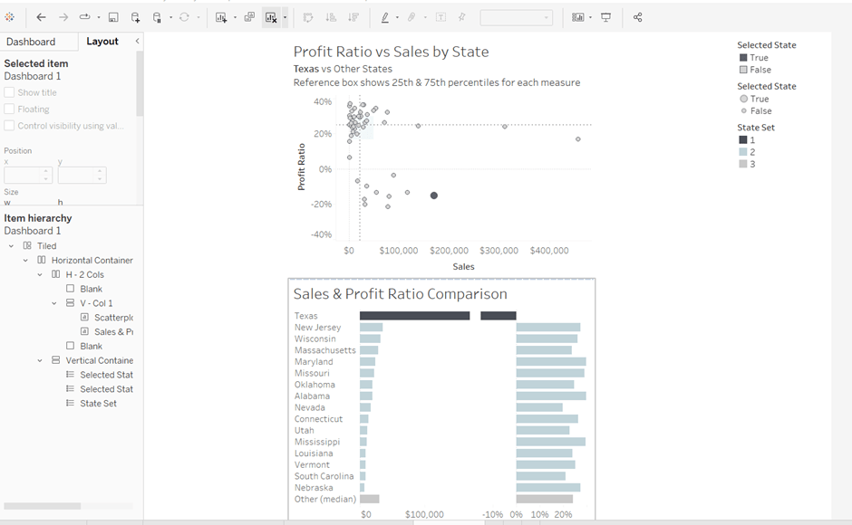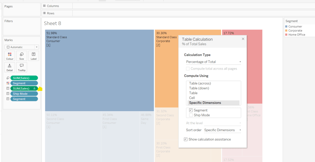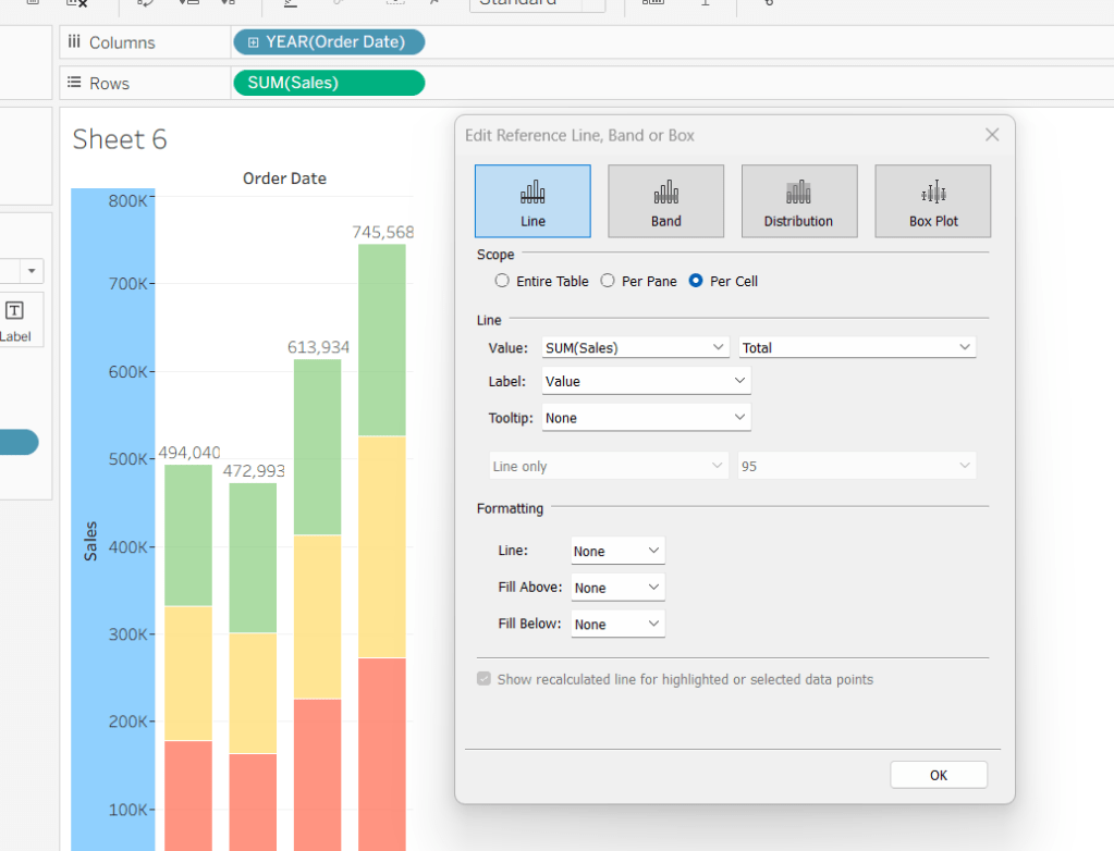 Add a reference line to the Sales axis that displays the value of Total Sales per cell