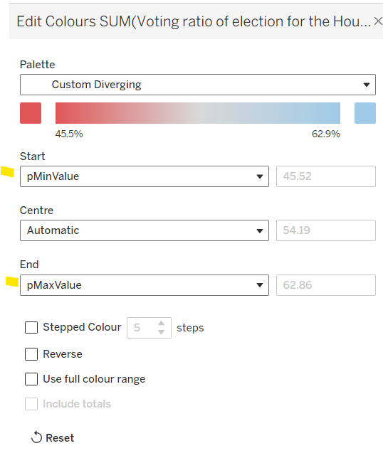 These actions change the value displayed in the pColourBy parameter when the ‘title’ of the charts is clicked on.
