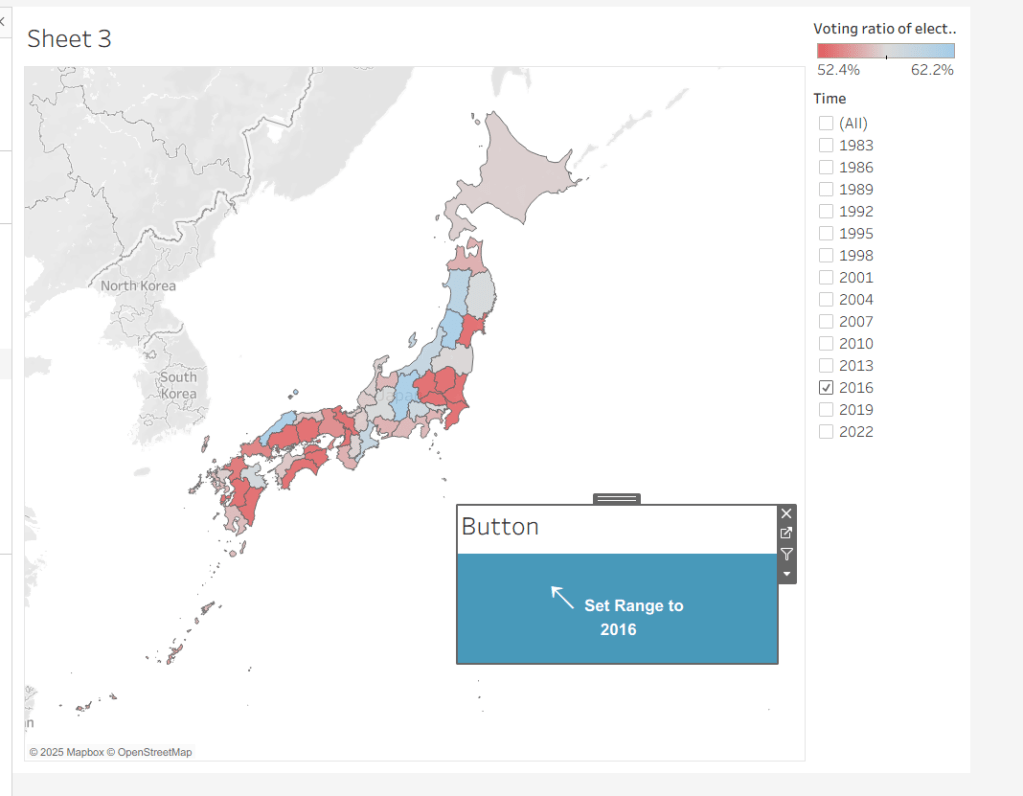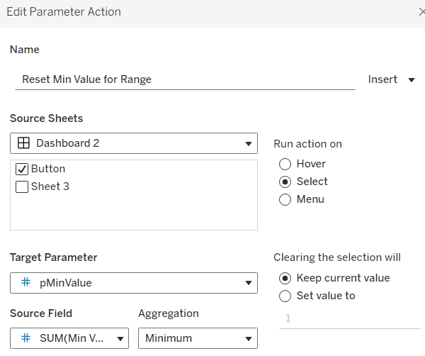 On select of the Region sheet on the dashboard, target the Region worksheet directly, passing the selected values of True = False. Show all values when selection is cleared.