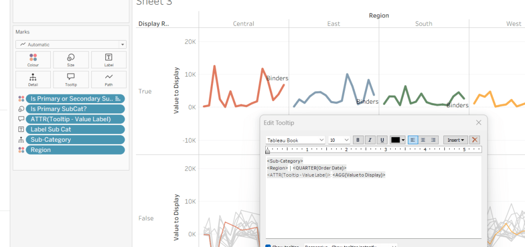 Right click on the ‘Region’ text in the column heading and hide field labels for rows. Format the reference line to align middle right.