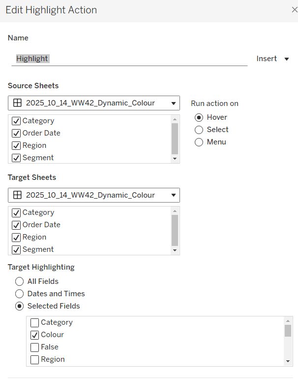 On hover of any of the charts on the dashboard, target all other charts, highlighting based on the Colour field only.