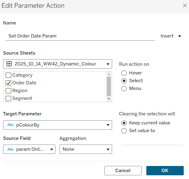 On Select of the Order Date sheet, set the pColourBy parameter with the value from the param Order Date field.