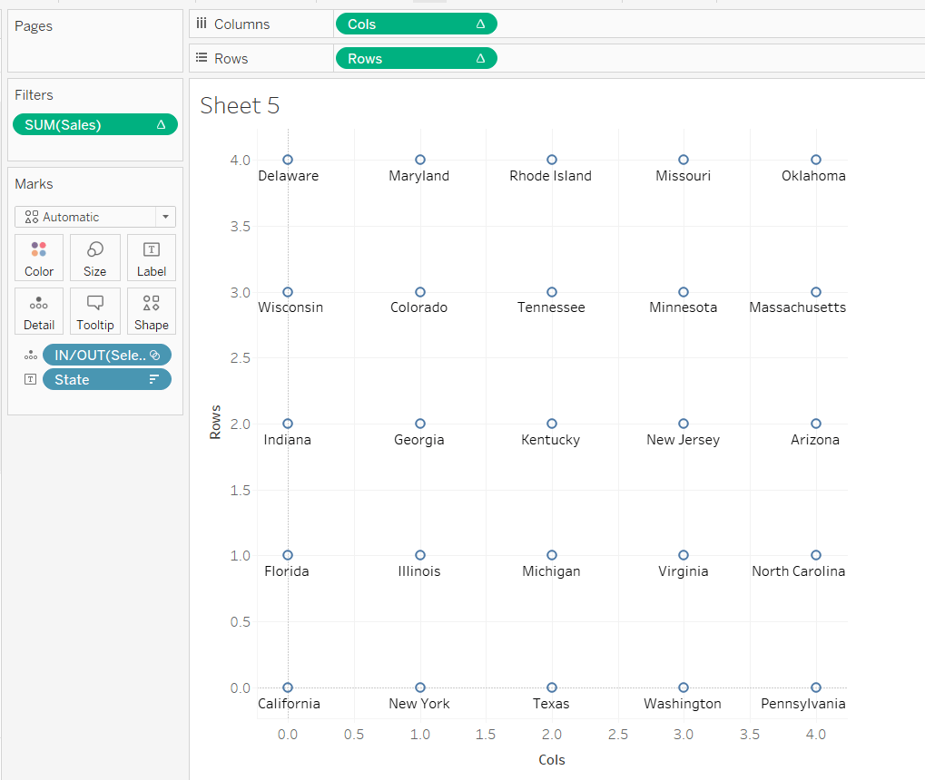 So now we’ve got the core viz nailed, we need to address the layout, which is to show a gauge for each of the top n manufacturers based on Sales. This means we need to have the gauges indexed/ranked from 1 to n based on total Sales, and then arrange in a grid so that top left is the manufacturer with the highest sales, and bottom right is the manufacturer with the lowest sales. For this we need to assign a row and column number against each manufacturer.