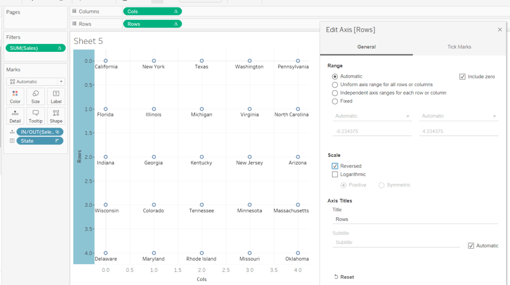 Hide the Rowsv2 and ColsV2 fields from displaying (uncheck show header). Show the Longitude axis, and fix it to start at 0 but end ‘automatic’. Then hide the axis again (this ensures the arc lands on the row divider).