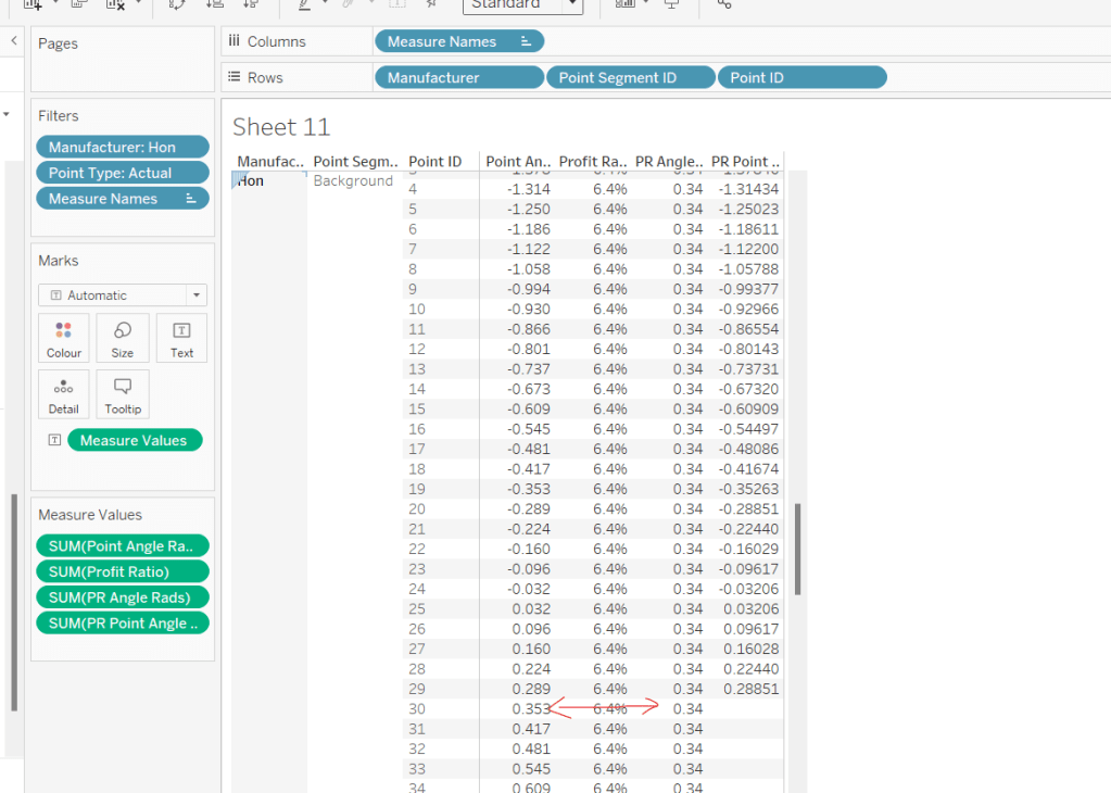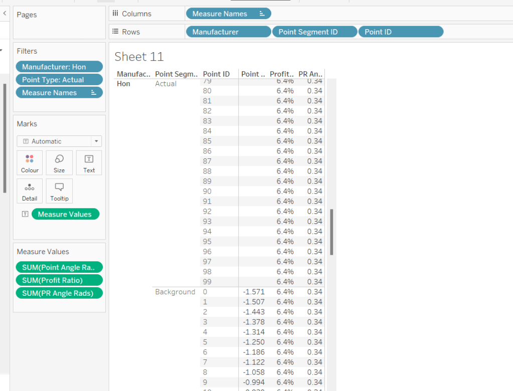 To understand what I did, build out a tabular sheet that is filtered to Manufacturer = Hon and Point Type = Actual, and shows Manufacturer, Point Segment ID and Point ID on Rows with Point Angle Rads, Profit Ratio and PR Angle Rads as measures.