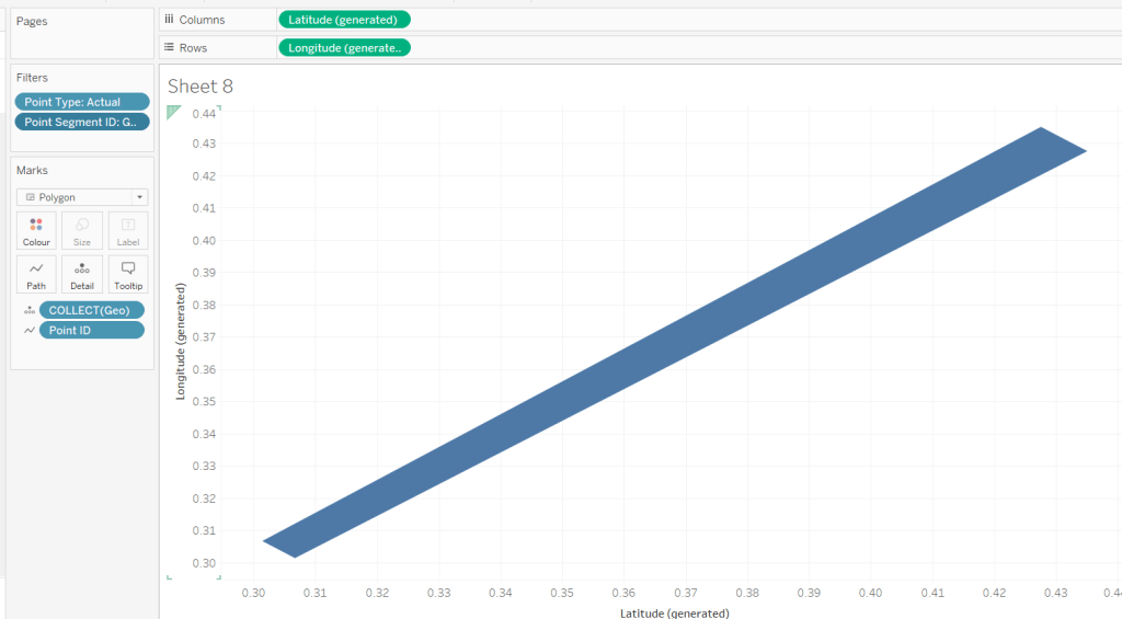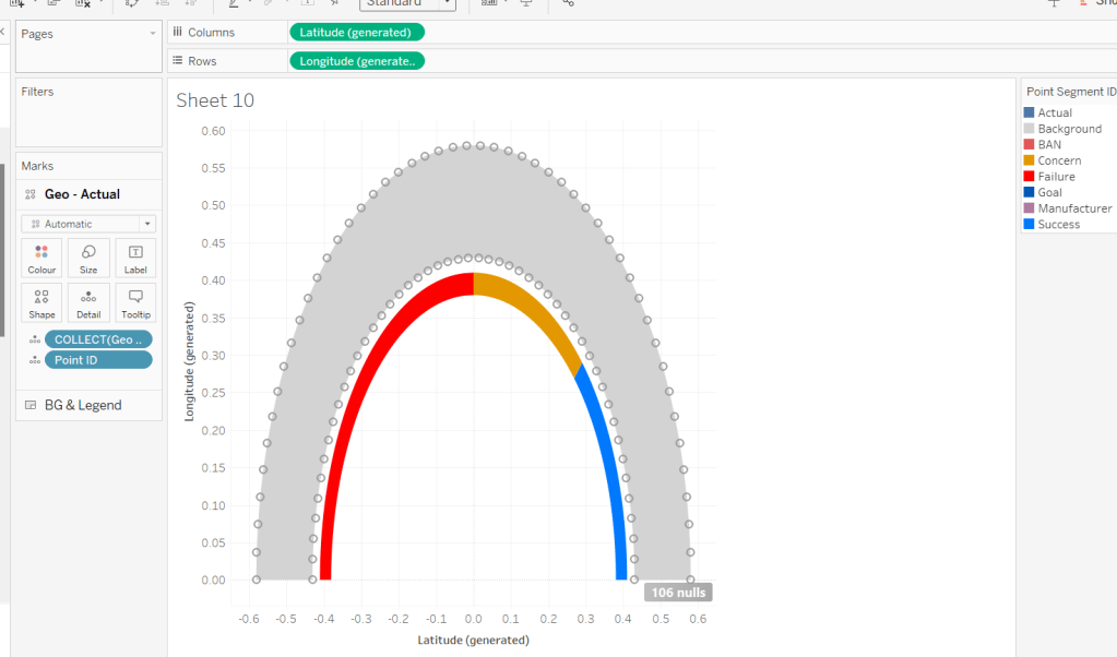 When building we’re going to be using map layers (and at this point, we can’t add a layer to this sheet). We’ll also be defining calculations based on which feature of the viz we’re focussed on, as we can’t apply filters to the sheet (if you remove the ones applied, it will look a little crazy!). But if you change the Point Segment ID filter to Goal, you’ll get the shape of the goal indicator ‘reference line’.