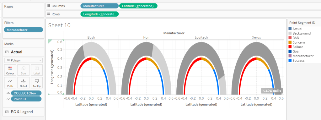 It’s drawing the points for a complete semi-circle, as every Manufacturer is being included. To help get the rest of the display right, for the various permutations, add Manufacturer to filter and filter to Hon, Bush, Logitech and Xerox. Add Manufacturer to Columns too. You should now see the marks stop at various positions around the arc. The filters will be adjusted later when we tackle the trellis.